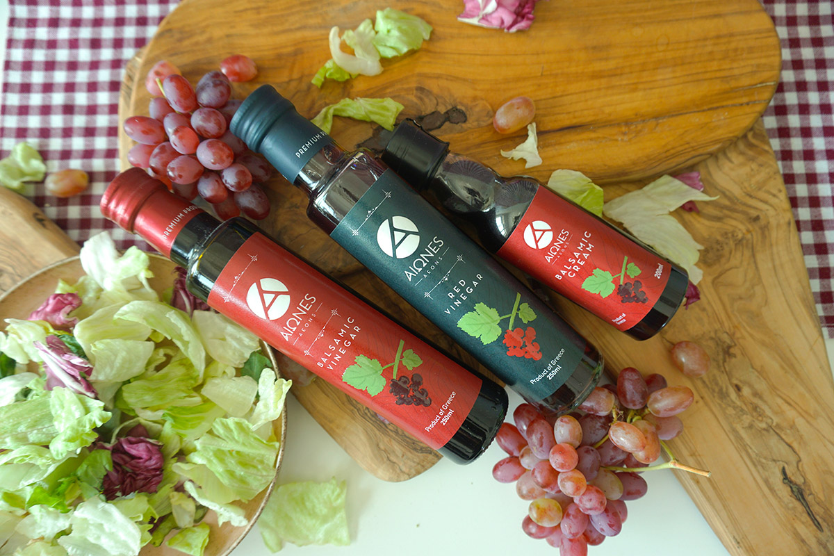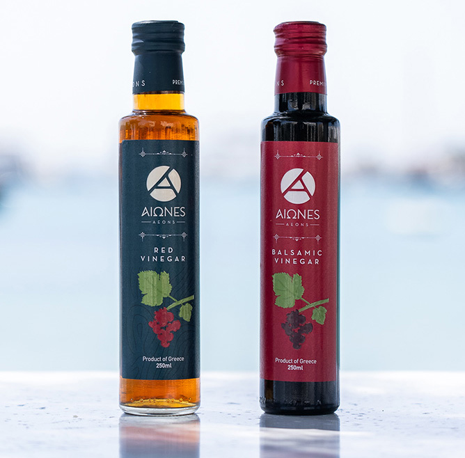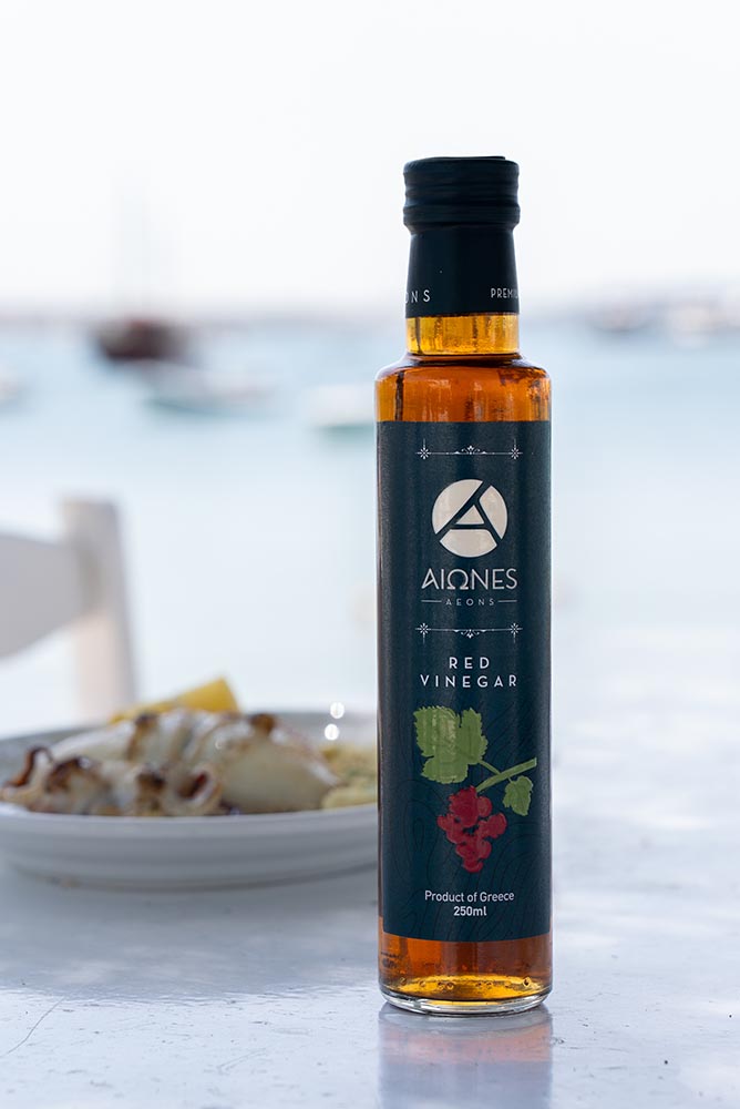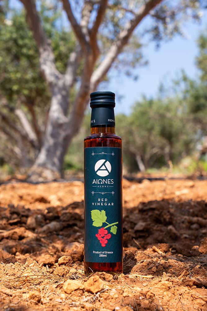 AEONS Red Vinegar má jasnou, červenou barvu, jemně ovocné aroma a lehce nasládlou chuť. Vyrábí se z hroznů odrůd Agiorgitiko, Merlot a Cabernet. Skvěle se hodí do sladkokyselých omáček, zálivek a marinád.